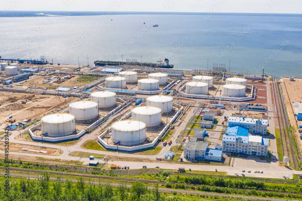 Business commercial trade fuel and energy transport by tanker vessel. Aerial view storage tank farm at night, Tank farm storage chemical petroleum petrochemical refinery product at oil terminal.