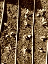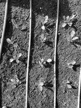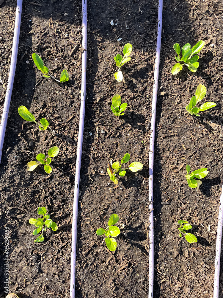 Young Bok choy plant on raised bed with tube irrigation system at public elementary school wintertime in Dallas, Texas, America