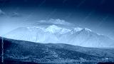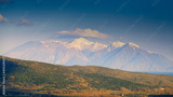 View of the highest snowy mountain of Samothrace island from the center of Gökçeada, Turkey. Greenery and sea view along the valley.