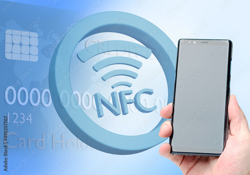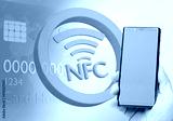 NFC payments. Customer is paying with smartphone using NFC technology. Big NFC logo. Near Field Communicaton technology. Contactless payment via smartphone. Payment technologies. 3d image
