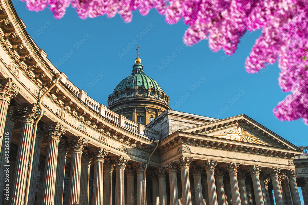 Kazan Cathedral columns against the blue sky, in the foreground brightly blossoming lilac flowers.