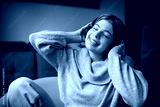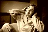 Smiling young girl listening to music in her living room and enjoying the afternoon rest