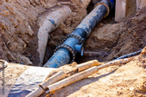 Installation of the distribution unit of heating and water supply network. Frame for connecting pipes in the trench of ground.