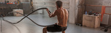 Back view of strong shirtless muscular man with battle rope doing exercise in functional training fitness gym