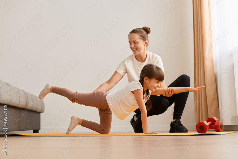Woman with little girl wearing sportswear doing sport exercises at home, kid standing in plank pose with arm leg lifted up, doing yoga fitness training workout at home, stretching core exercise.