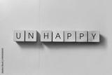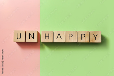 Wooden cubes with the inscription: unhappy, happy. A person's choice in life: happy or unhappy