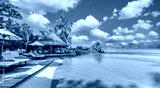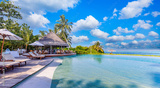 Outdoor tourism landscape. Luxury beach resort with swimming pool and beach chairs or loungers under umbrellas with palm trees and blue sky. Summer travel tourism poolside, beachfront vacation holiday