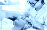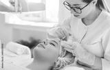 Beautiful lady getting corrective dermal aesthetic improvement treatment and receiving safe forehead youth injection. Skincare professional injecting restylane, sculptra or PRP for perfect face