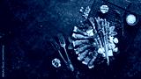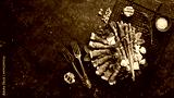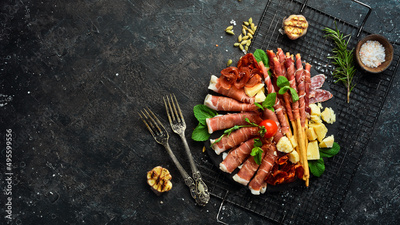 Italian ingredients: ham, prosciutto, salami, parmesan, olives, bread sticks. On a black stone background.