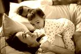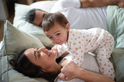 Smiling baby boy lying in bed with his mummy in morning. Happy parents and their child waking up together in morning. Family at home concept