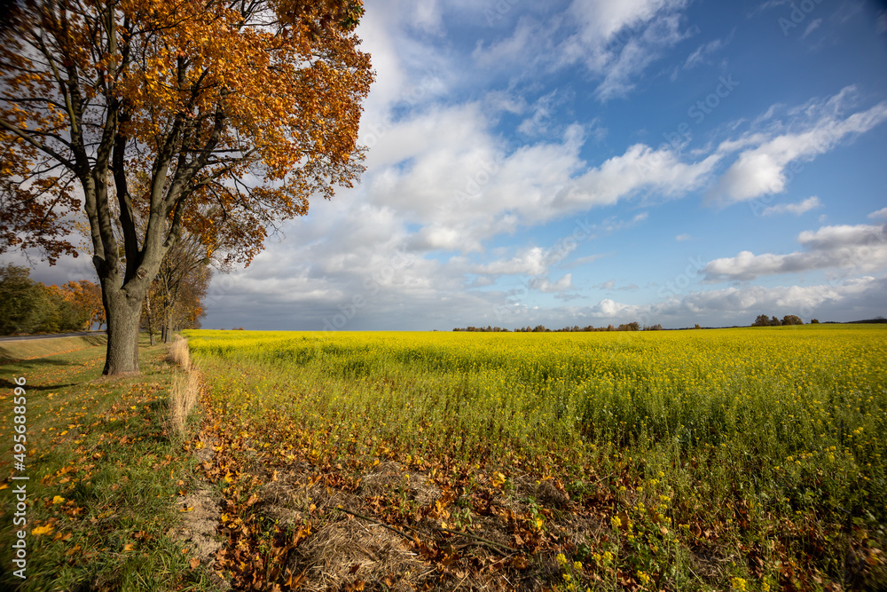 jesień, pole, trawa, drzewa, rzepak, krajobraz, chmury