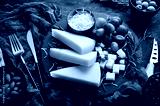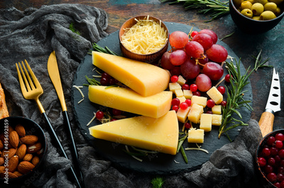Pieces of delicious parmesan cheese and snacks. Rustic style. Free copy space.