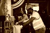 Two people black man African American worker control heavy machine in the factory.