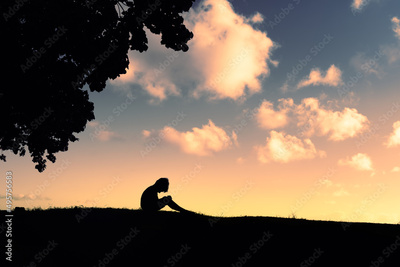 Sad and unhappy little boy silhouette sitting alone outdoors