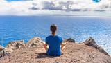 Meditation, spiritual enlightenment, peace of mind, woman meditating on a ocean cliff