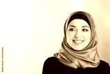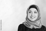 A young smiling muslim woman wearing a hijab over blur background.
