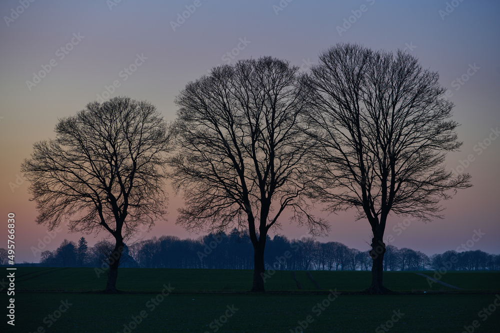 Malowniczy wiosenny zachód słońca za rzędami bezlistnych drzew. Magia i tajemnica.