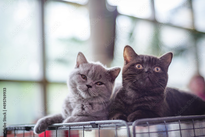Two cats of the breed scottish-strait are sitting on the cage