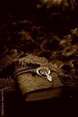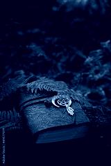 witch magic book and wiccan amulet with pentagram on forest natural background. Esoteric Ritual, spiritual practice. Mysticism, divination, modern wicca, occultism concept.