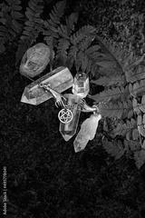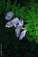 quartz crystals and amulet pentacle with fern leaves on natural dark forest background. gemstones for healing Magic Crystal Ritual, Witchcraft. spiritual esoteric practice, Reiki therapy. top view