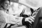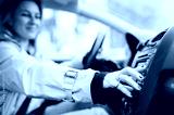 A woman driver is playing the radio in the car.