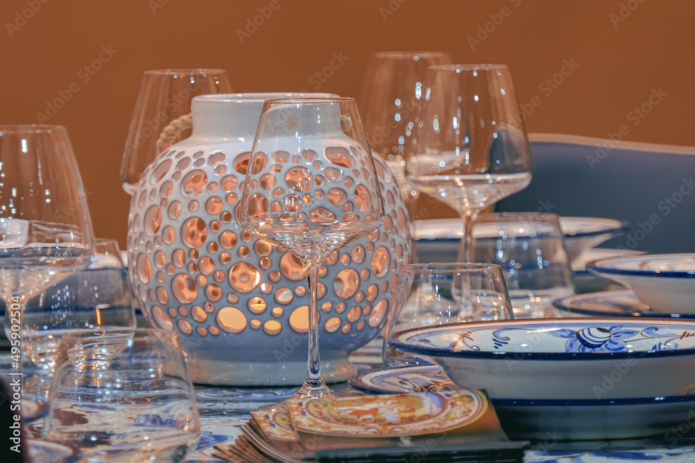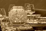 A lamp with candles inside on a served table.