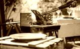 Chef cooking meat at barbecue home dinner outdoor at backyard garden - Focus on steak