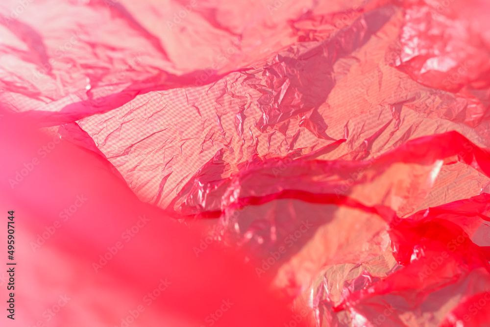 The texture of a crumpled pink package with selective focus, pink abstraction