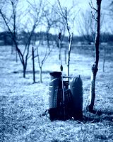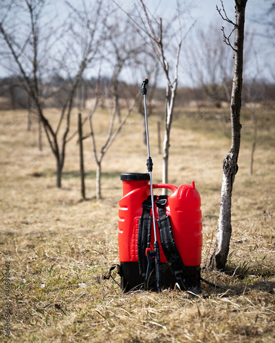 Red sprayer in spring garden. Gardening agriculture concept