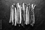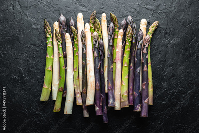 Green, purple and white asparagus sprouts on black board top view flat lay. Food photography