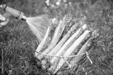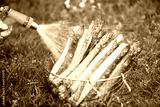 Farmer washes asparagus sprouts with garden hose. Fresh green, purple and white asparagus sprouts. Food photography