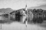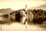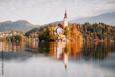 Colorful autumn view of Bled lake in Julian Alps, Slovenia. Pilgrimage church of the Assumption of Maria on a foreground. Landscape photography