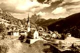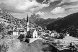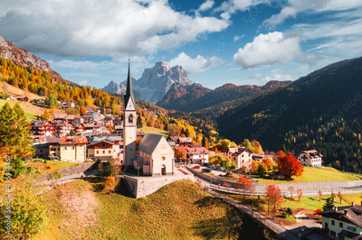 Aerial drone flight over San Lorenzo Catholic church in Selva di Cadore village. Biautiful small city in autumn Dolomites mountains. Dolomite Alps, Province of Belluno, Italy