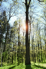 green trees in forest, beautiful natural background. Spring landscape. beautiful sunny day in forest.