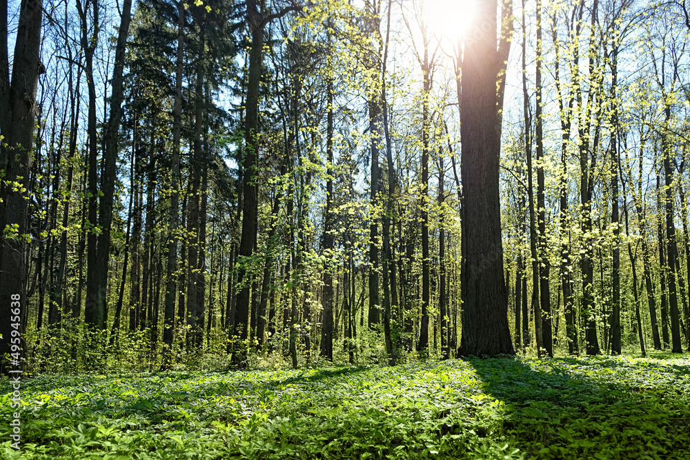 green trees in forest, beautiful natural background. Spring landscape. beautiful sunny day in forest.