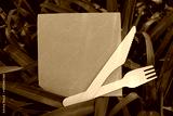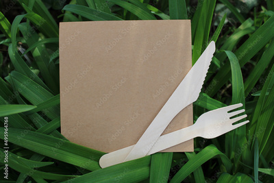 Fourchette et couteau en bois dans l'herbe, mangez sain, mangez local
