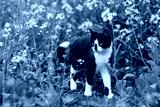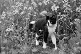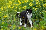 Black and white cat in a field with yellow flowers.