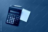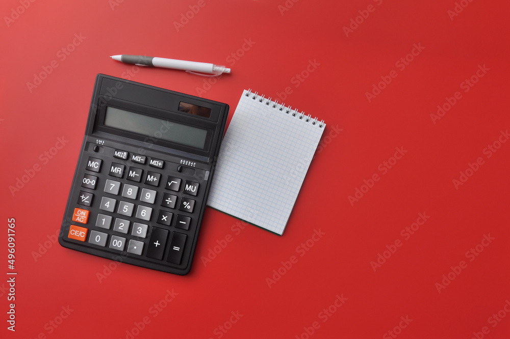 Black calculator, notepad and pen on a red background. Symbol of data counting and problem solving
