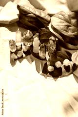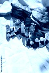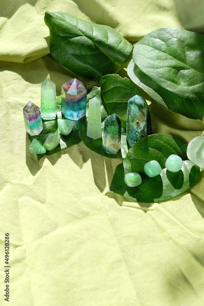 gemstones and green leaves on green fabric background. Minerals set for esoteric ritual, spiritual Magic practice, relaxation, meditation, life balance. Wiccan Witchcraft concept. hard light