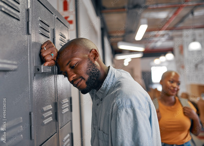 A young black student leans against locker looking stressed as friend walks past