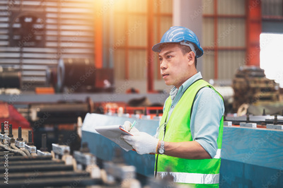 Asian engineer working control machine in factory.