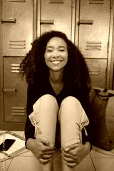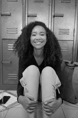 A happy young students sits in front of lockers ready for school