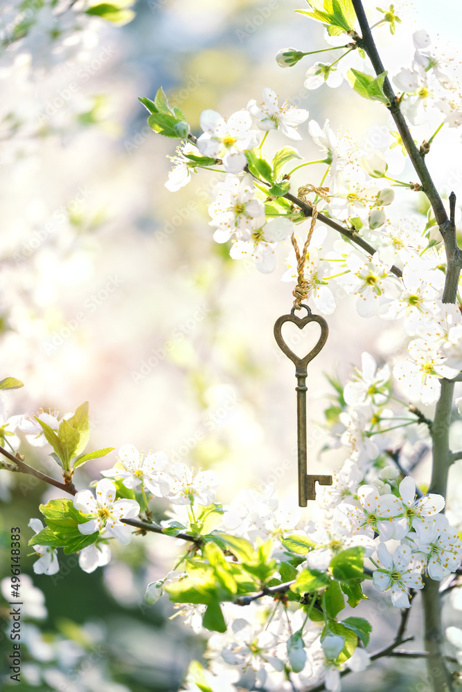 Vintage golden key hanging on blossoms cherry branch, gentle sunny natural background. symbol of secret garden. spring season. copy space