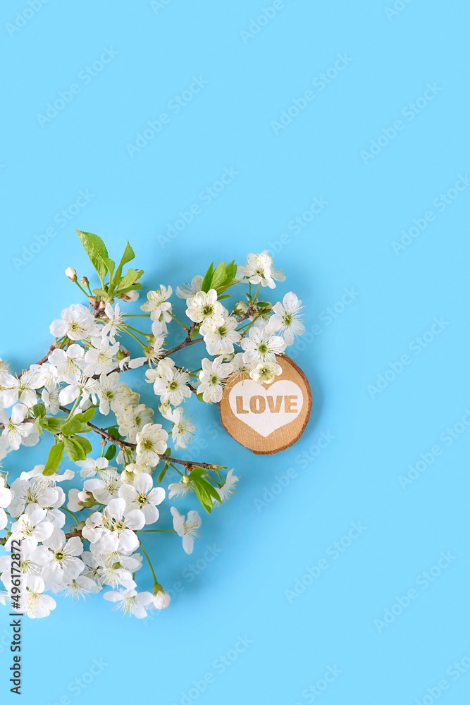 white cherry flowers and wooden love heart on blue background. romantic concept, love symbol, minimal style. spring season. flat lay
