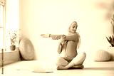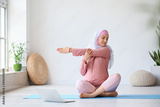 Young pregnant Muslim woman practicing yoga with laptop at home