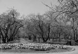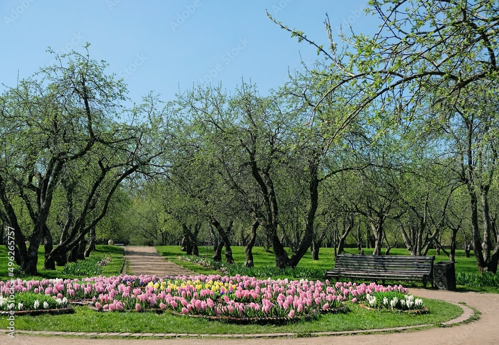 Alley with green trees and flower bed with hyacinths in spring park. Relaxing walking in sunny day. beautiful spring season.