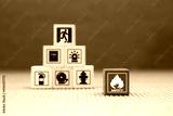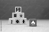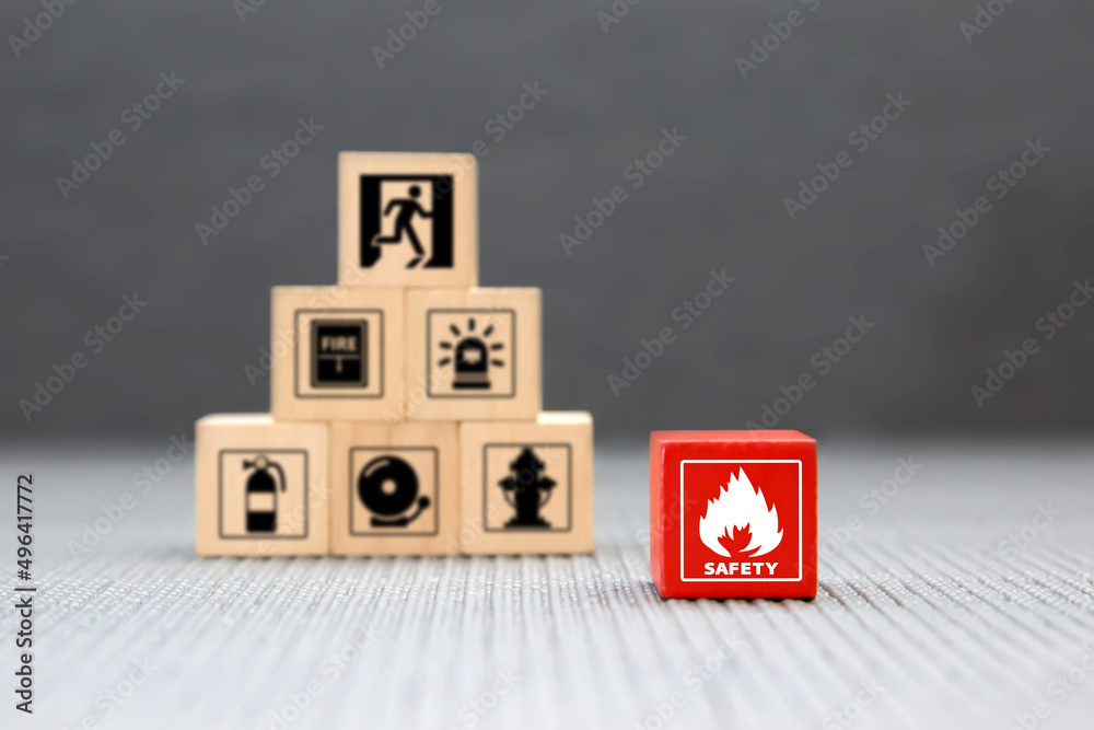 Cube wooden block stack with fire icon and door exit sing or fire escape with prevent icon and fire extinguisher and emergency prevention or protection symbol for safety and rescue.