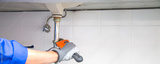 Technician plumber using a wrench to repair a water pipe under the sink. Concept of maintenance, fix water plumbing leaks, replace the kitchen sink drain, cleaning clogged pipes is dirty or rusty.
