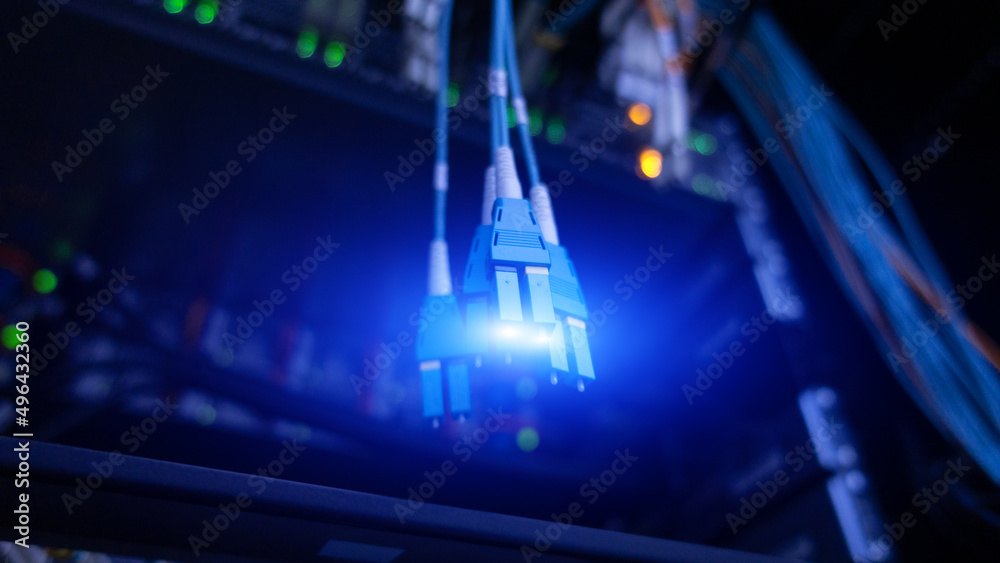 Fiber optic and hub in dark server room.