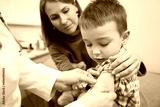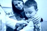 Doctor placing medical plaster on child arm after vaccination
